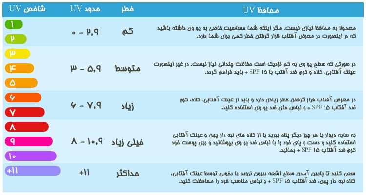 میزان اشعه UV در ساعات وسط روز، بین ۱۰ صبح تا ۴ بعداز ظهر، از مواقع